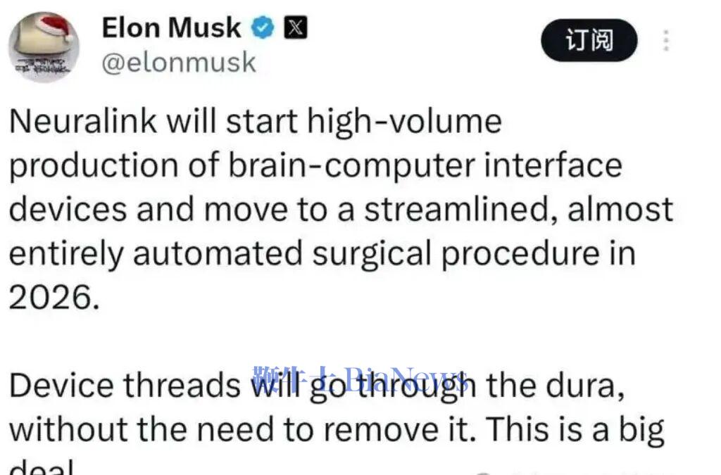 就在最近,老马在社交平台上宣布:2026 年,Neuralink 将进入大规模生产阶段。
